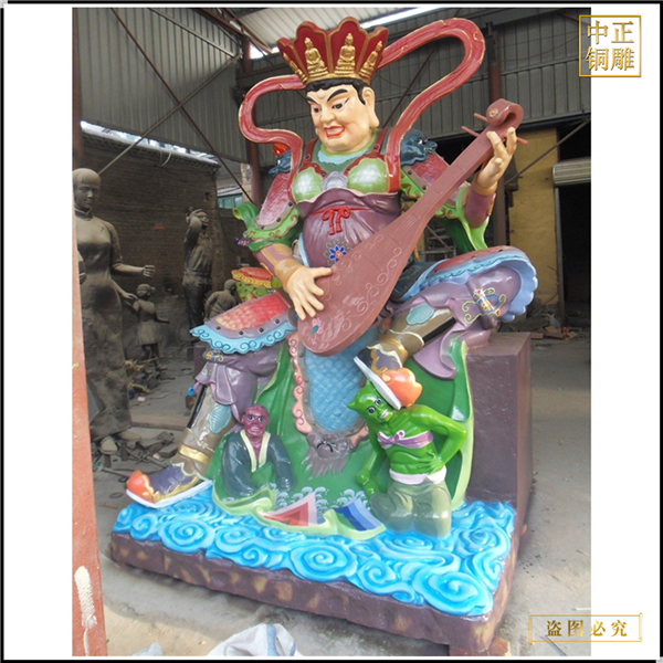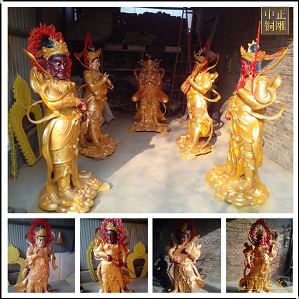 東方的持國天王是手中拿著琵琶的,守護(hù)的東勝神州,如果是彩繪四大天王銅佛像,通常是白色的,西方廣目天王是手上纏有龍,守護(hù)的是西牛賀州,它身上的主要顏色為紅色,南方的增長天王是手中有一把寶劍,它守護(hù)的是南贍部州,身上的顏色為青色,如果是彩繪四大天王銅佛像,那么青色肯定會吸引你的眼球,記得是增長天王啊,北方的多聞天王手中的寶傘,是法器中最好辨別的一個,有寶傘的形象必然也就會很快的知道是哪個天王,它主要守護(hù)的是北俱蘆州。