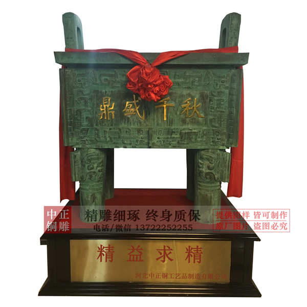 傳說夏禹曾收九牧之金,鑄九鼎于荊山之下,以象征九州,并在上面鐫刻魑魅魍魎的圖形,讓人們警惕,防止被其傷害。自從有了禹鑄九鼎的傳說,鼎就從一般的炊器而發展為傳國重器。國滅則鼎遷,夏朝滅,商朝興,九鼎遷于商都亳(bó)京;商朝滅,周朝興,九鼎又遷于周都鎬(hào)京。此后,就把定都或建立王朝稱為“定鼎”。中正銅雕-銅鼎廠家位置,唐縣銅鼎廠家位置,大型銅鼎廠家位置,追求卓越、開拓創新、“重合同”、“守信譽”、讓客戶滿意的經營理念。唐縣中正銅雕工藝品廠竭誠為國內外客戶提供優秀的服務,愿與新老客戶攜手共創美好未來。